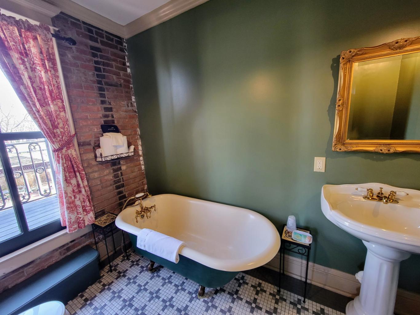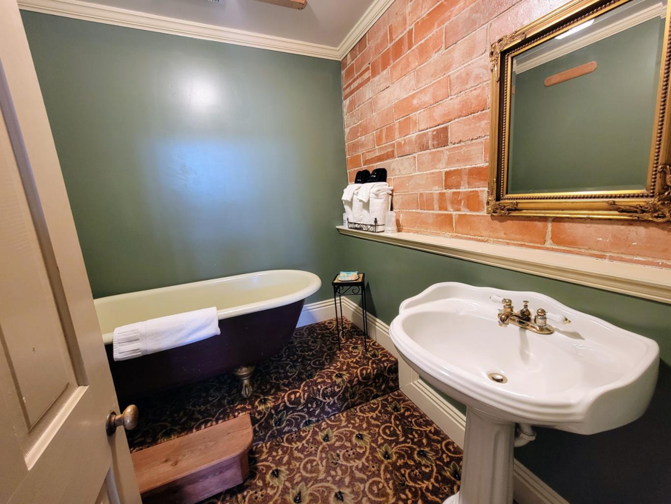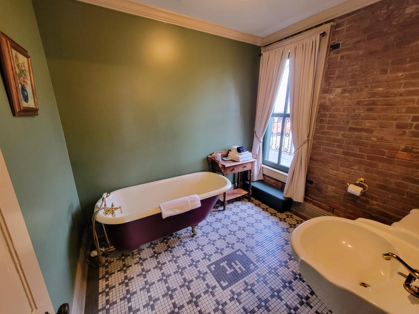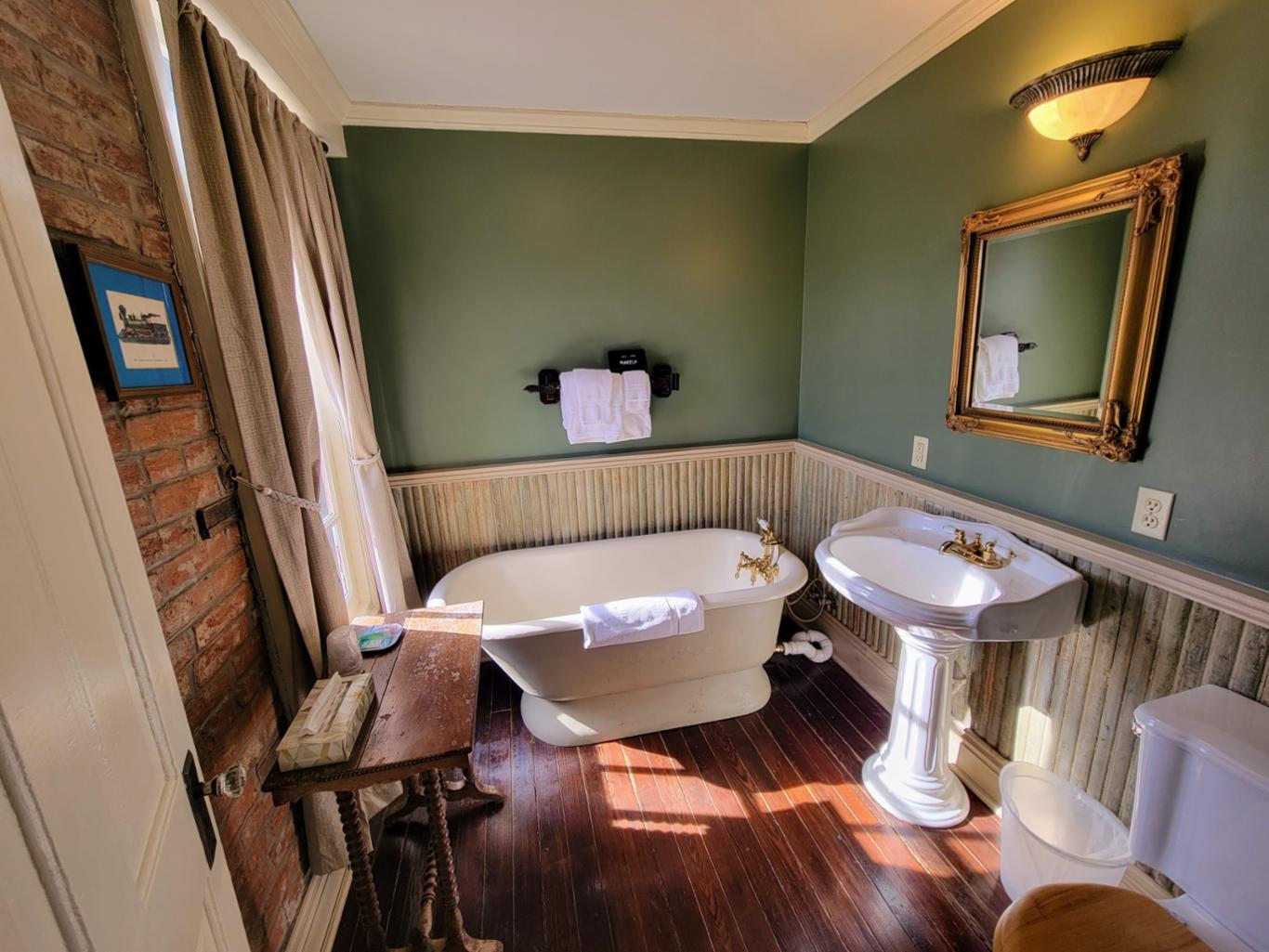 The Reading room is located in an annex building next to the original hotel and has a private entrance onto Main Street. There are 2 queen beds and private bath with clawfoot bathtub. The Reading room shares the annex building with the New Orleans room, and the two can be joined if booked together. * This is one of our pet friendly rooms *