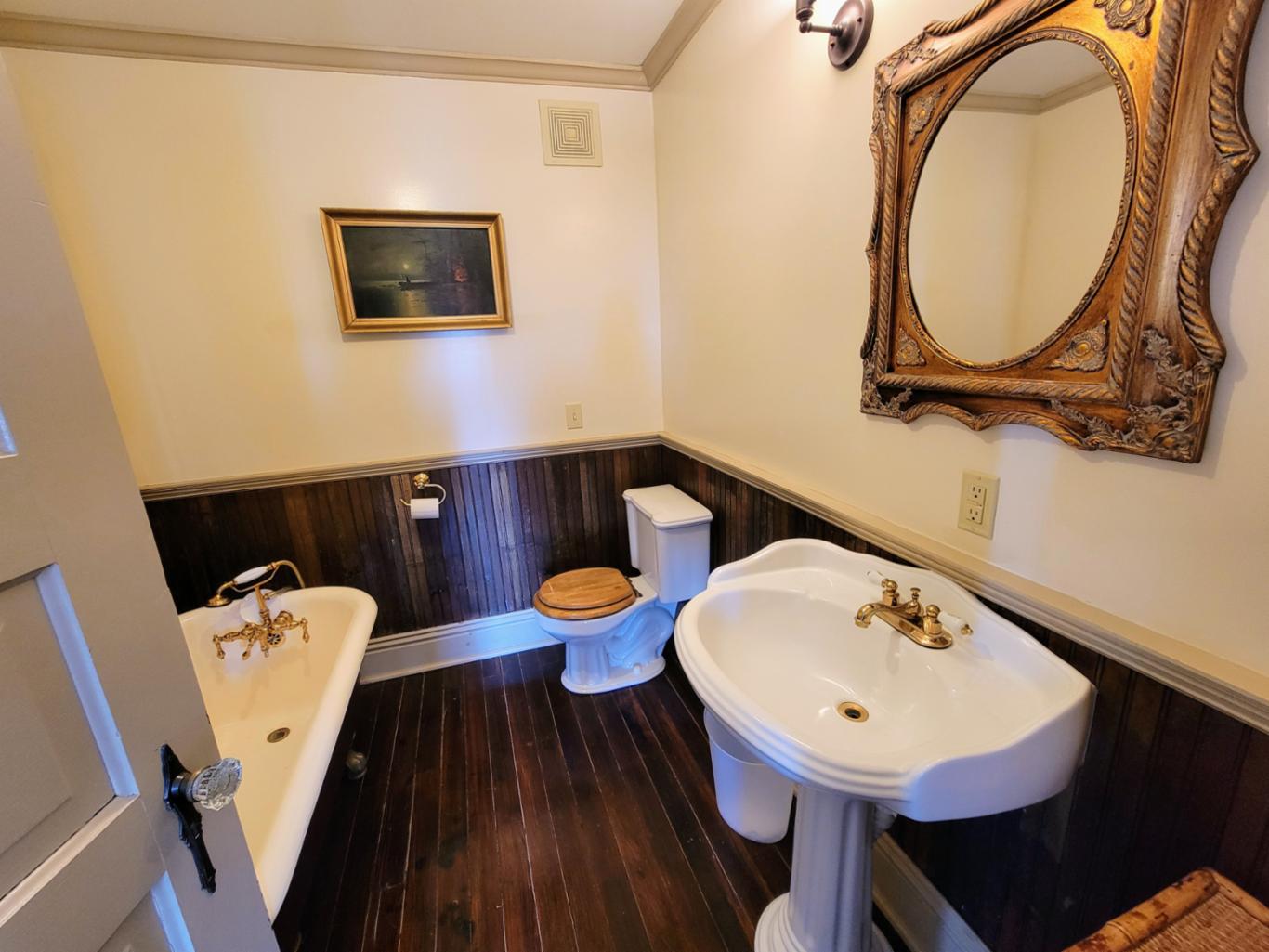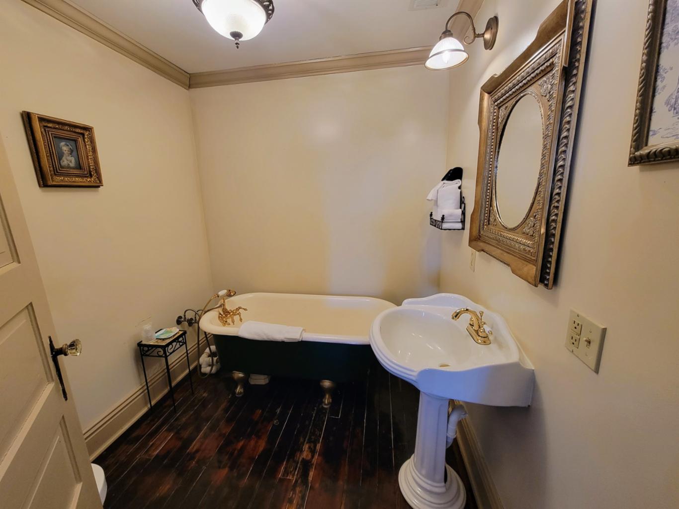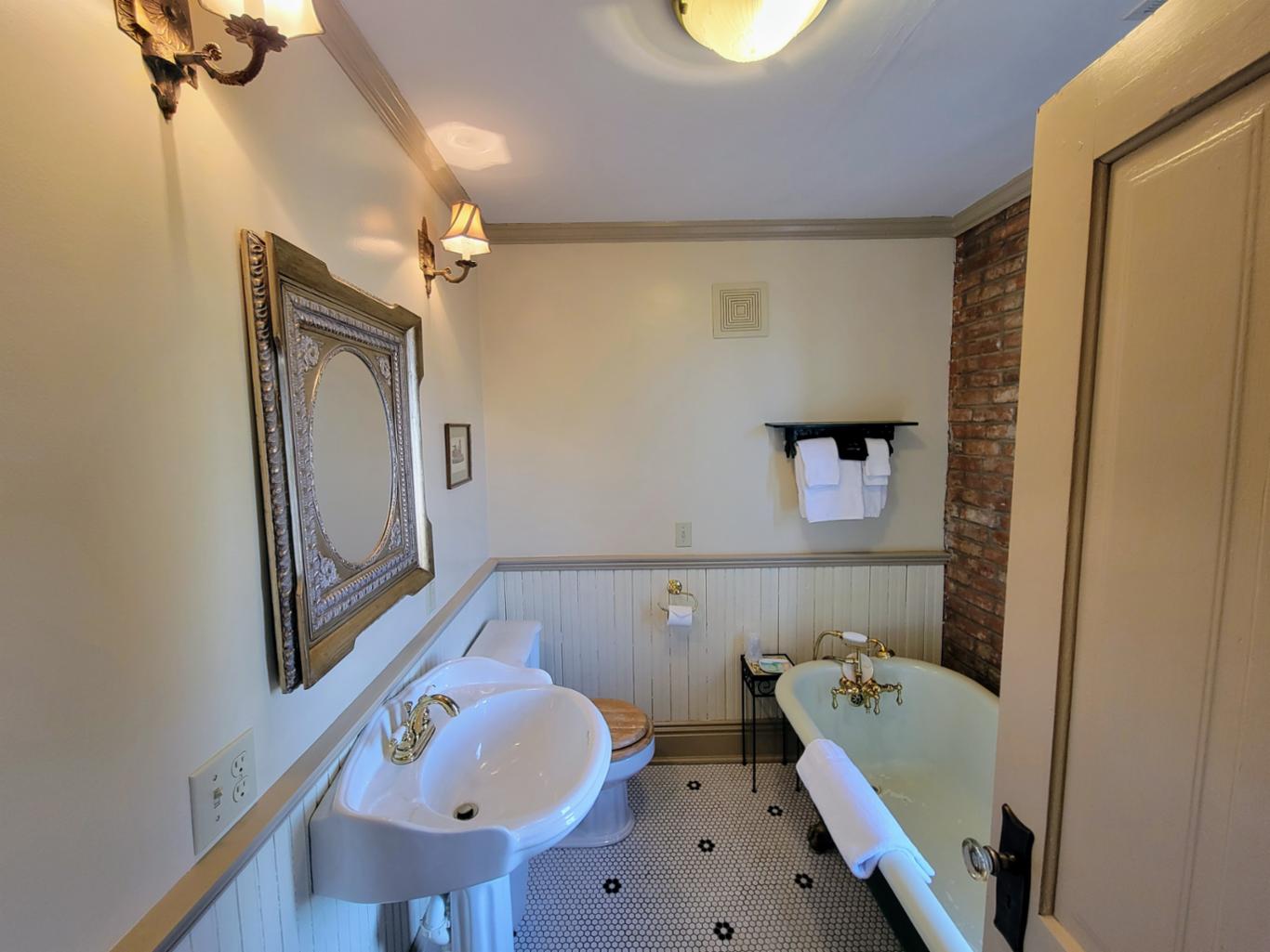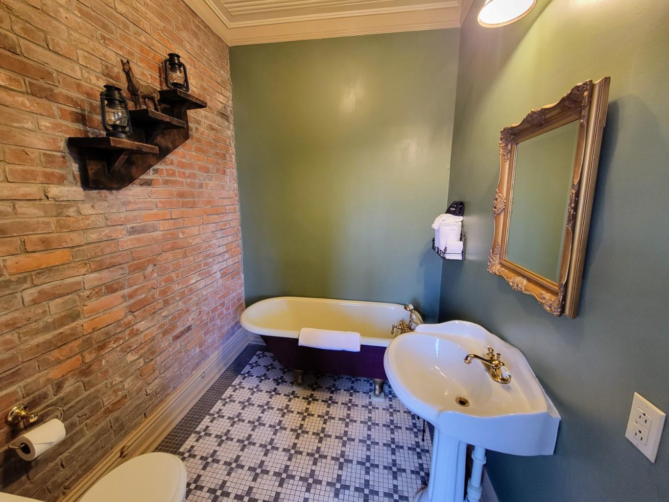 The Reading room is located in an annex building next to the original hotel and has a private entrance onto Main Street. There are 2 queen beds and private bath with clawfoot bathtub. The Reading room shares the annex building with the New Orleans room, and the two can be joined if booked together. * This is one of our pet friendly rooms *