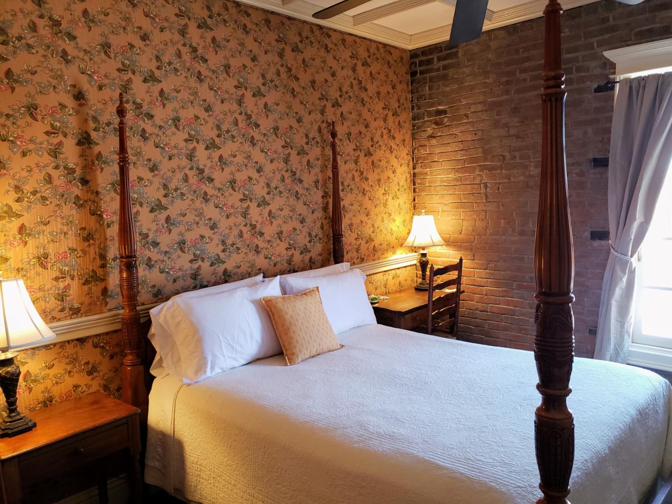 The Reading room is located in an annex building next to the original hotel and has a private entrance onto Main Street. There are 2 queen beds and private bath with clawfoot bathtub. The Reading room shares the annex building with the New Orleans room, and the two can be joined if booked together. * This is one of our pet friendly rooms *