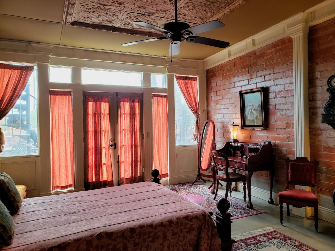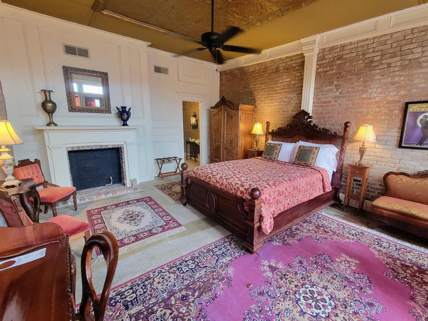 The Reading room is located in an annex building next to the original hotel and has a private entrance onto Main Street. There are 2 queen beds and private bath with clawfoot bathtub. The Reading room shares the annex building with the New Orleans room, and the two can be joined if booked together. * This is one of our pet friendly rooms *