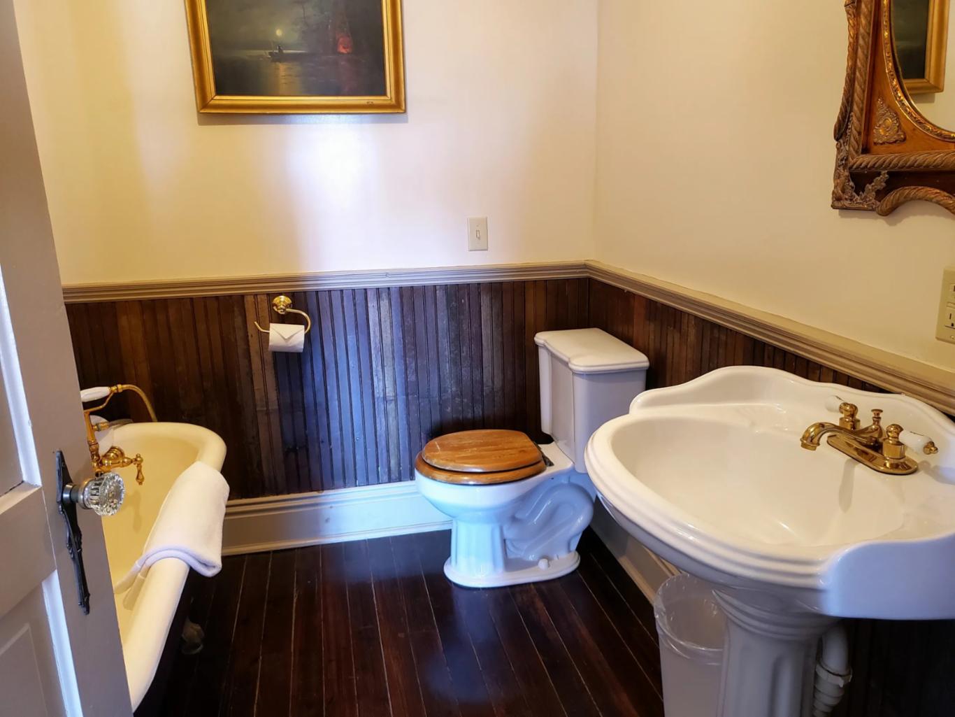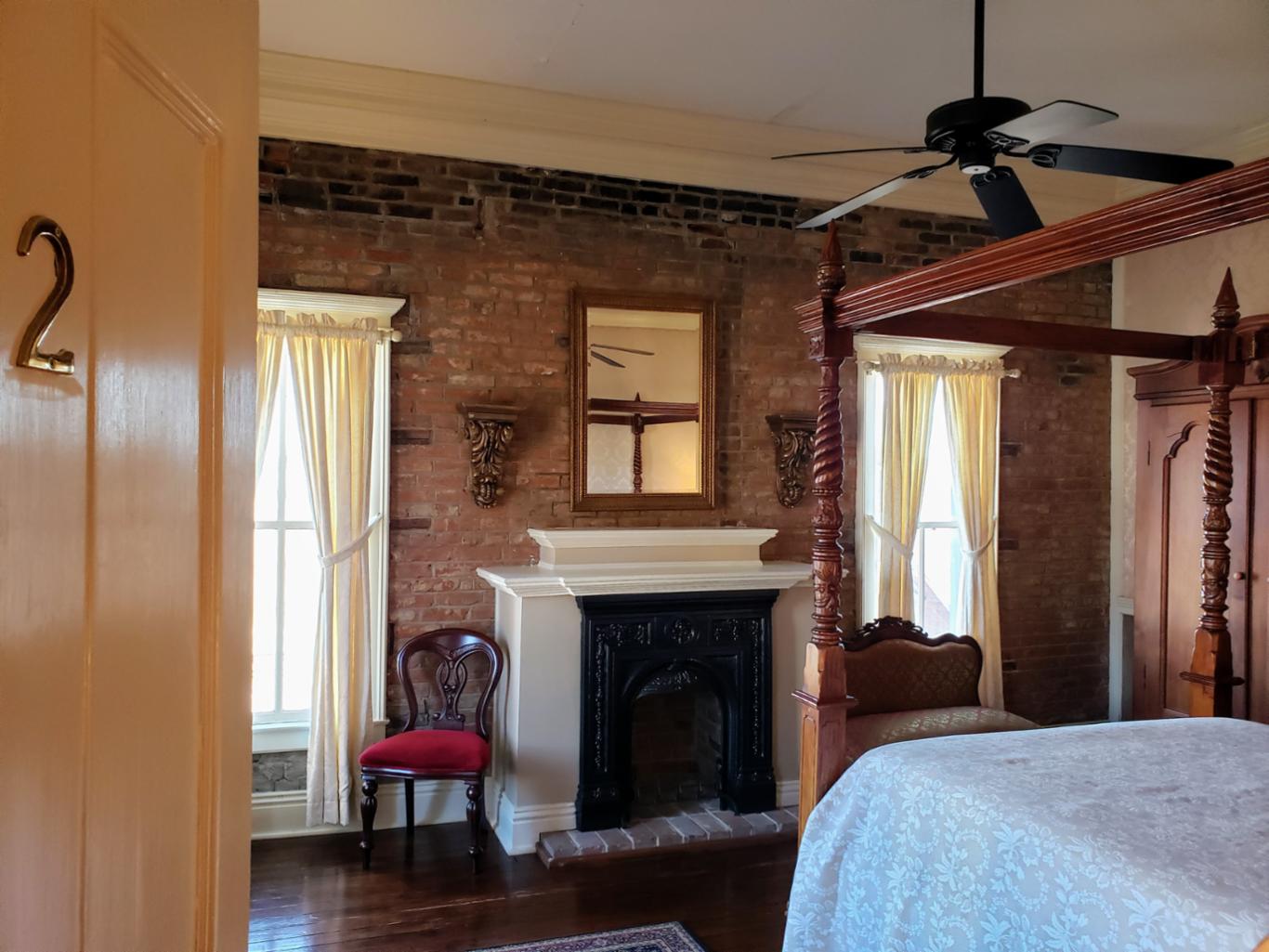 The Reading room is located in an annex building next to the original hotel and has a private entrance onto Main Street. There are 2 queen beds and private bath with clawfoot bathtub. The Reading room shares the annex building with the New Orleans room, and the two can be joined if booked together. * This is one of our pet friendly rooms *